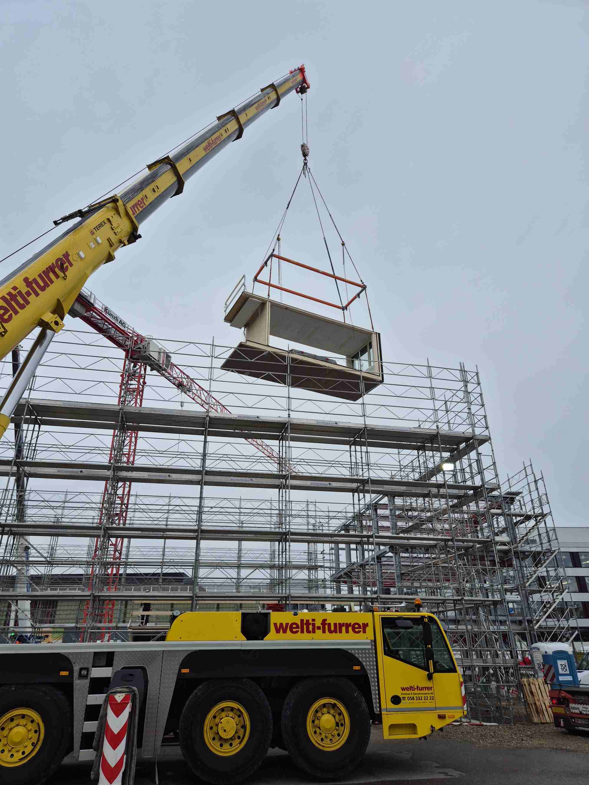 Und wer zurzeit beim Empa-Areal unterwegs ist, sieht unter Umständen die ersten Module der Gebäude am Kran hängen.